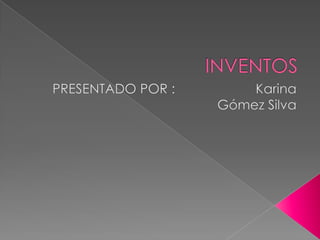 La presentación describe cuatro importantes inventos: la máquina de vapor, el automóvil, la bombilla eléctrica y los rayos X.