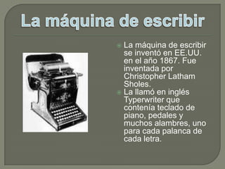 Este documento resume varios inventos importantes del siglo XIX como la máquina de escribir (1867), la máquina de coser (1846), la cámara fotográfica (1888), el submarino (1891), la bicicleta (1885), el teléfono (1864), la aspirina (1897), el ascensor (1851) y el automóvil (1885). Muchos de estos inventos revolucionaron la comunicación, el transporte y la medicina.