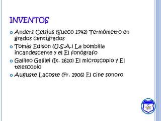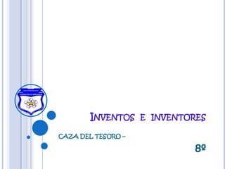 Este documento presenta una actividad de caza del tesoro para estudiantes de 8o grado sobre inventos e inventores. Los estudiantes trabajarán en parejas para crear una línea de tiempo con al menos 20 inventos importantes, documentarán 10 de estos inventos con detalles e imágenes, y modificarán uno de los inventos seleccionados presentando las modificaciones en una maqueta reciclable.