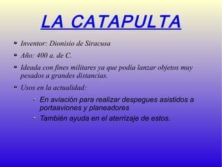 El documento describe varios inventos griegos antiguos como la catapulta, los Juegos Olímpicos, la máquina de vapor y el tornillo de Arquímedes. También discute los orígenes de la democracia en Grecia, donde los ciudadanos se reunían para debatir y votar soluciones a problemas. Muchos de estos inventos e instituciones siguen siendo importantes en la actualidad.