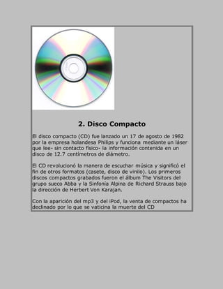 Los principales inventos tecnológicos descritos en el documento incluyen la laptop, el CD, la memoria USB, el GPS, el airbag, el DVD, el teléfono móvil, el fax, los videojuegos, Internet, el iPod, el microondas, el velcro y los Post-It. Muchos de estos inventos revolucionaron sus respectivas industrias y cambiaron la forma en que las personas se comunican, almacenan y consumen información. El documento también destaca la creciente popularidad de Facebook como plataforma de comunicación social.