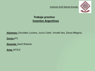 Este documento presenta de forma cronológica los inventos argentinos desde 1810 hasta 1999, incluyendo al inventor, el año y una breve descripción de cada invento. Entre los inventos presentados se encuentran la máquina hiladora de 1813, el sistema dactiloscópico de 1891, la transfusión sanguínea de 1914, la tecnología para dibujos animados de 1917, el primer helicóptero eficaz de 1916 y el semáforo para ciegos de 1983. El documento concluye presentando otros inventos recientes como la j