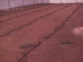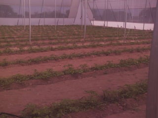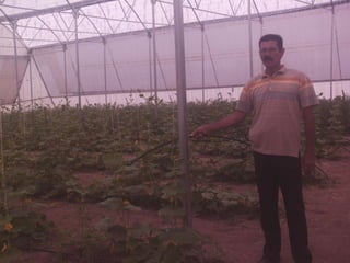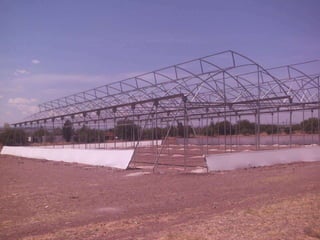 El documento describe un invernadero tipo II con un área de 1,071 metros cuadrados y 3 túneles de 8.50 x 42 metros cada uno. Se plantaron pepinos de la variedad Pointset-76 y jitomates Río Grande, con proyecciones de cosechar media tonelada de pepinos y una tonelada y media de jitomates. El costo del invernadero fue de $957,557 pesos mexicanos.