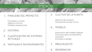 Este documento presenta un proyecto de invernadero controlado automáticamente. El objetivo principal es crear condiciones óptimas para cultivar plantas controlando la humedad, temperatura y luz mediante sensores y actuadores. Se propone utilizar un invernadero tipo SOCKER de IKEA y cultivar la planta Venus atrapamoscas. El control se realizaría con una placa Arduino Uno conectada a sensores DHT11, LDR y un higrómetro, y actuadores como servomotores, LEDs y un buzzer. El presupuesto total