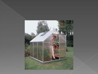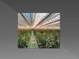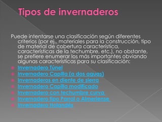 El documento describe diferentes tipos de invernaderos. Un invernadero es una construcción de vidrio o plástico donde se cultivan plantas a una temperatura más alta que en el exterior. Se describen e identifican los principales tipos de invernaderos, como el túnel, el capilla (de dos aguas), en dientes de sierra, capilla modificado, de techumbre curva, almeriense y holandés. Para cada tipo se brindan detalles sobre sus características y ventajas.