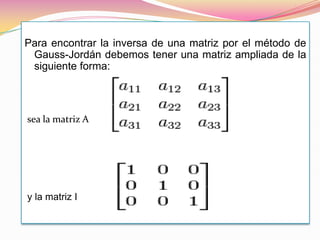 Este documento describe dos métodos para calcular la inversa de una matriz. Explica que la inversa de una matriz cuadrada A es la matriz B tal que AB = BA = I, donde I es la matriz identidad. Luego detalla que el método de Gauss-Jordan involucra ampliar la matriz con la matriz identidad y aplicar operaciones de filas para obtener la matriz inversa. El segundo método usa el concepto de determinante.