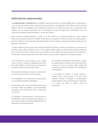 El documento habla sobre las criptomonedas, definidas como monedas virtuales que usan cifrado digital para realizar transacciones de forma segura y descentralizada. Explica cómo funcionan a través de la tecnología blockchain y por qué ha aumentado el interés en invertir en ellas debido a su liquidez, rentabilidad potencial y riesgos asociados a su volatilidad. También compara las criptomonedas con el dinero fiat y los metales preciosos, señalando ventajas como menores costos de transacción y emisión limit