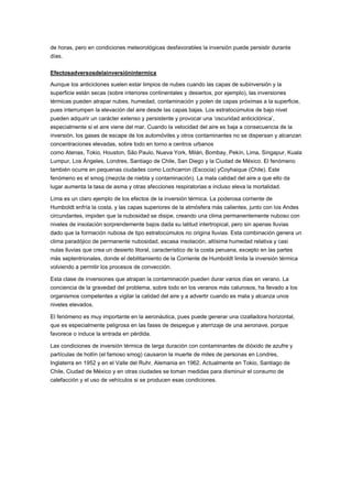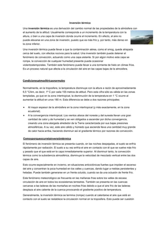 Una inversión térmica ocurre cuando el aire más frío y denso se encuentra cerca del suelo y el aire más cálido se encuentra en las capas superiores, lo que impide que el aire se eleve y mezcle. Esto puede causar smog al atrapar contaminantes cerca del suelo, y puede durar varios días. Las inversiones térmicas también pueden causar tormentas si la capa superior se rompe, y afectan negativamente el despegue y aterrizaje de aeronaves.