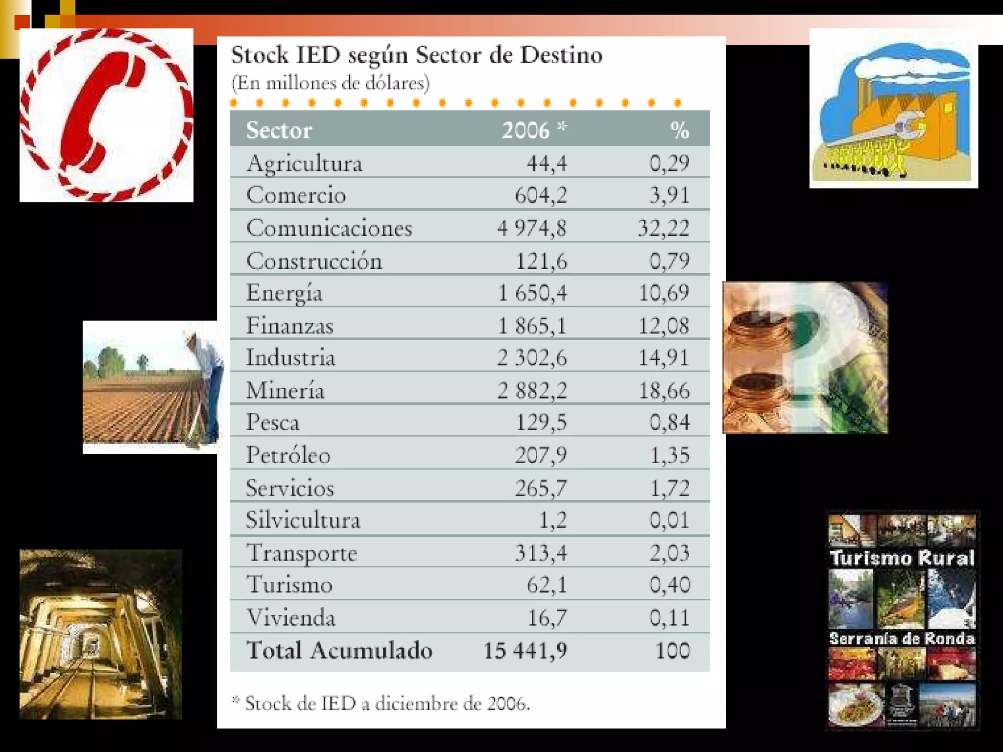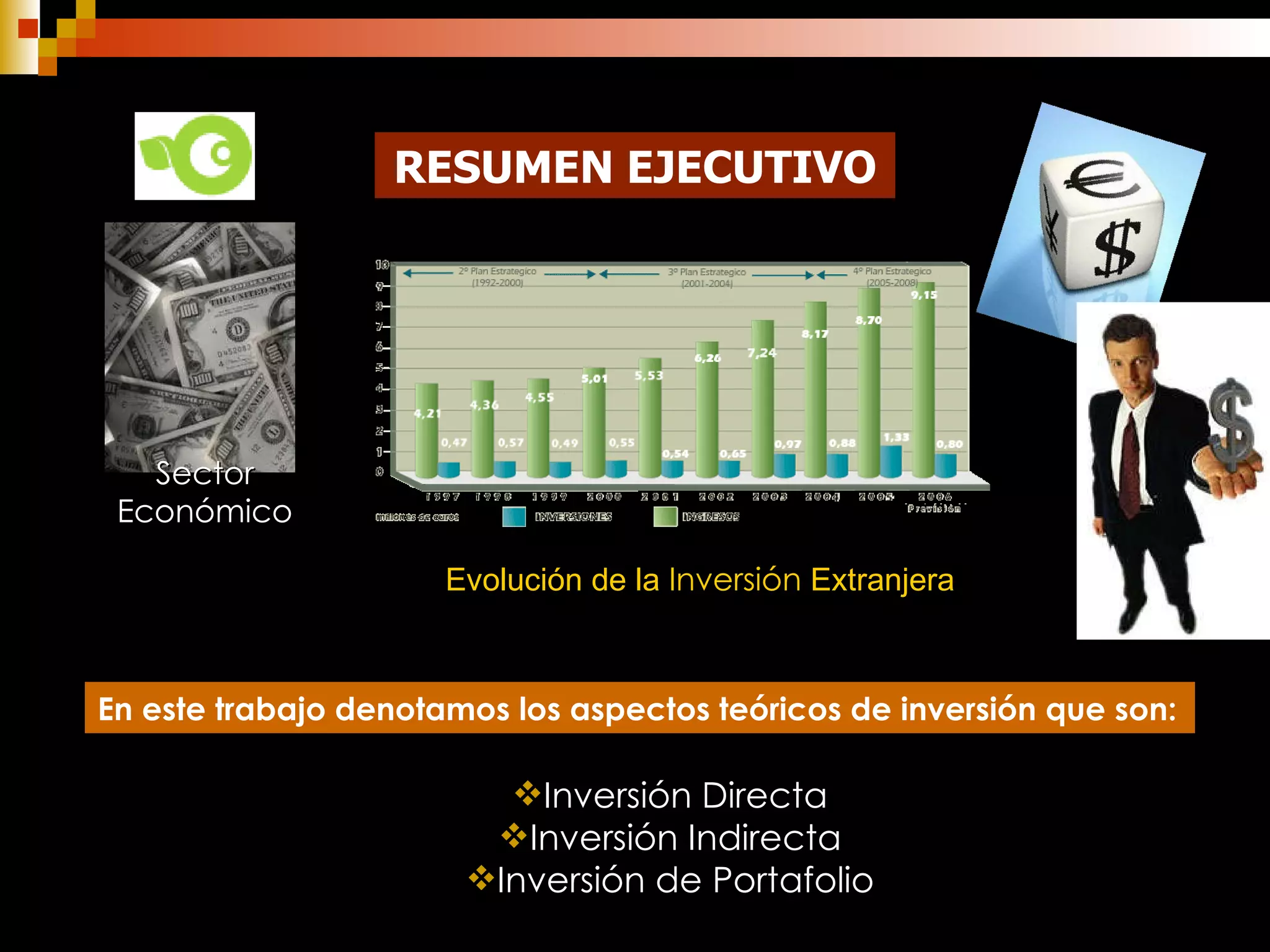 Este documento trata sobre la inversión extranjera en el Perú. Explica los diferentes tipos de inversión extranjera como la inversión directa, indirecta y de portafolio. También describe los principales efectos de la inversión extranjera directa como el desarrollo económico, tecnológico y de la competitividad. Por último, analiza la situación de la inversión extranjera en el Perú en décadas recientes, los principales inversionistas y sectores de inversión.