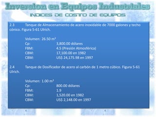 Este documento describe varios equipos e instalaciones industriales, incluyendo un tanque de almacenamiento de acero inoxidable de 7000 galones, un tanque dosificador de acero al carbón de 1 metro cúbico, y un reactor enchaquetado. Para cada elemento, se proporciona información sobre el volumen, costo de compra, factor de escala y costo de construcción en 1982 y 1997. El documento también incluye tablas que resumen los costos unitarios y totales de varios tipos de maquinaria y equipos.