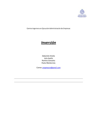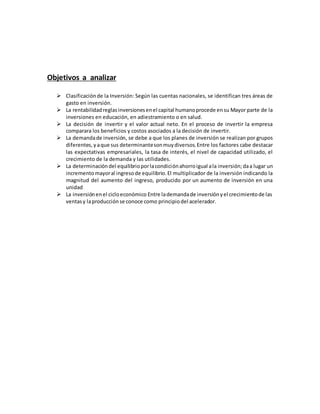 Este documento define e identifica diferentes tipos de inversión como inversión bruta, neta e inversiones en capital humano. Explica conceptos clave como la decisión de invertir basada en el valor actual neto, los factores que influyen en la demanda de inversión como las expectativas y tasas de interés, y cómo el principio del multiplicador muestra que un aumento en la inversión genera un mayor ingreso de equilibrio. También cubre el papel de la inversión en el ciclo económico según el principio del acelerador.