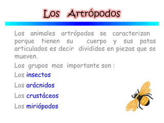 Los invertebrados son el grupo más numeroso de animales, carecen de columna vertebral y esqueleto interno articulado. Se clasifican en artrópodos como los insectos y crustáceos, moluscos como caracoles y calamares, gusanos con cuerpo blando y alargado, equinodermos con simetría radial como estrellas de mar, medusas transparentes y flotantes, y esponjas con forma de saco que filtran el agua.