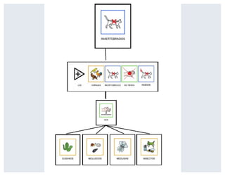 Este documento describe las características de varios grupos de animales invertebrados, incluyendo esponjas, celentéreos, moluscos, artrópodos, gusanos y equinodermos. Todos estos animales carecen de columna vertebral o esqueleto interno y se reproducen mediante huevos de los que nacen larvas. Cada grupo tiene características distintivas como la presencia o ausencia de conchas, el número de patas, y si respiran a través de branquias o pulmones.