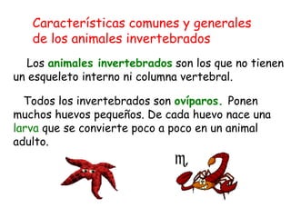 Este documento proporciona información sobre las características generales de los animales invertebrados, incluyendo que no tienen esqueleto interno ni columna vertebral, ponen huevos de los que nacen larvas, y cubiertas protectoras como conchas o caparazones. También resume los principales grupos de invertebrados como esponjas, celentéreos, equinodermos, anélidos, moluscos, artrópodos e informa sobre sus características distintivas.
