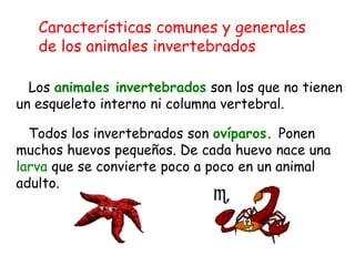 Los animales invertebrados carecen de esqueleto interno y son principalmente ovíparos, produciendo larvas a partir de huevos. Se clasifican en grupos como moluscos, artrópodos, gusanos, poríferos, equinodermos, y medusas, cada uno con características específicas y modos de vida. Estos animales pueden ser acuáticos o terrestres, y algunos poseen protecciones como conchas o caparazones.