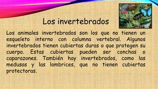 Este documento describe los principales grupos de invertebrados. Los invertebrados son animales que no tienen esqueleto óseo con columna vertebral. Se dividen en poríferos, cnidarios, gusanos, moluscos, artrópodos y equinodermos. Cada grupo se caracteriza por sus rasgos morfológicos y de comportamiento.