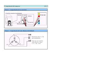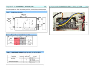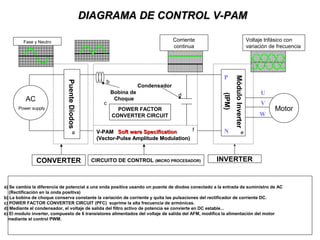 Este documento describe el funcionamiento de un inverter para compresor de aire acondicionado. Explica que un puente de diodos rectifica la corriente alterna de entrada, una bobina de choque filtra las pulsaciones y un circuito PFC suprime armónicos. Un módulo inverter convierte la corriente continua en voltaje trifásico de frecuencia variable para accionar el motor. El microprocesador controla el módulo inverter mediante PWM para variar la velocidad del compresor.