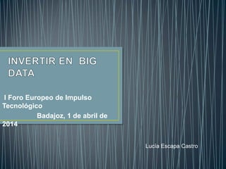 El foro europeo de impulso tecnológico en 2014 expuso la creciente inversión en big data por parte de diversas organizaciones y sectores, destacando su aplicación en análisis, optimización de procesos y salud. También se discutió la evolución de los datos y la importancia de los metadatos para su análisis efectivo, así como el futuro del big data como servicio en diferentes industrias. La conferencia subrayó la necesidad de especialistas en datos y la gestión de la privacidad y la seguridad en un mundo cada vez más digitalizado.