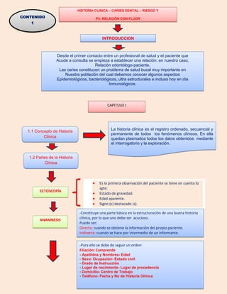 Este documento presenta información sobre la historia clínica odontológica, la caries dental, el riesgo de caries y la relación con el flúor. En particular, describe los componentes de la historia clínica odontológica como la anamnesis, el examen físico y el diagnóstico; explica conceptos como la caries dental, los factores de riesgo y el papel protector del flúor; y concluye enfatizando la importancia de una evaluación clínica exhaustiva para establecer un diagnóstico y plan de