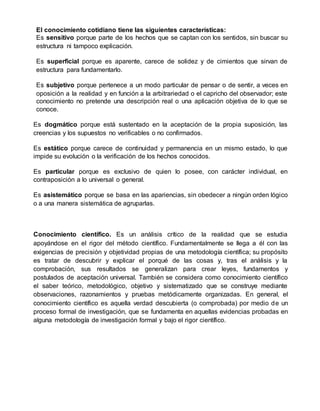 El documento define y compara diferentes tipos de conocimiento, incluyendo el conocimiento cotidiano, científico y los grados del conocimiento. Explica que el conocimiento cotidiano se basa en la experiencia directa y las percepciones, mientras que el conocimiento científico se obtiene a través del método científico de observación sistemática, formulación de hipótesis y pruebas. También discute que la finalidad del conocimiento es entender la realidad y explicarla para llegar a la verdad. Finalmente, resume los pasos clave del mé