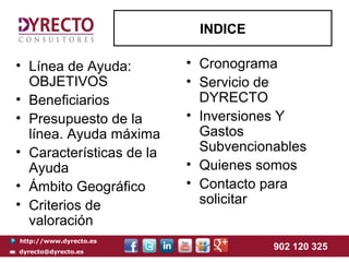 El documento presenta los servicios de Dyrecto, consultores especializados en ayudar a empresas a obtener financiamiento a través de préstamos y subvenciones en España, especialmente en proyectos de I+D+i. Ofrecen asesoría para maximizar las ayudas disponibles, asegurando el cumplimiento de requisitos y gestionando la presentación de solicitudes. También destacan su experiencia y éxito en la obtención de financiamiento para más de 500 empresas.