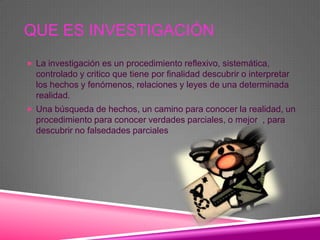 Este documento describe los conceptos básicos de la investigación. Explica que la investigación es un proceso sistemático para descubrir o interpretar los hechos de una realidad. Identifica tres tipos de investigación: histórica, descriptiva y experimental. También destaca los objetivos específicos y generales de una investigación, y los pasos clave para llevar a cabo una buena investigación como elegir un tema, encontrar información y tomar notas.