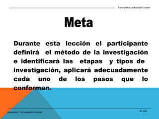 Este documento presenta una lección sobre el método de investigación para policías judiciales en Ecuador. La lección explica que el método de investigación es un procedimiento ordenado y sistemático utilizado por investigadores para llegar a la verdad sobre un hecho punible. Identifica las cinco etapas del método de investigación y seis tipos de investigación que los participantes aprenderán y aplicarán en un ejercicio práctico.
