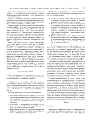 Este estudio analiza los resultados de un programa de entrenamiento en estrategias cognitivas de escritura desarrollado con 39 niños de 9 años con dificultades en el aprendizaje de la escritura. 22 niños del grupo experimental recibieron entrenamiento de 4 horas semanales durante 5 meses, enfocándose en procesos como la planificación, organización y producción de textos. Los resultados mostraron que la instrucción específica mejoró las habilidades de escritura de los niños con dificultades.