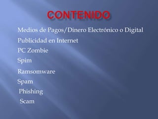 El documento resume varios temas relacionados con el comercio electrónico, incluyendo medios de pago digitales, publicidad en Internet, amenazas cibernéticas como PC zombies, spim, ransomware, spam y phishing, así como estafas como scam. Explica brevemente cada tema y sus características principales.