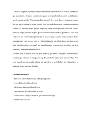 El documento discute el problema de impartir música inapropiada a niños en primaria. Observa que en la escuela Morelos I, los maestros ponen canciones agresivas que afectan el comportamiento de los niños. Propone educar a los padres, fomentar la autoestima de los niños, y trabajar actitudes de respeto en clase para resolver este problema.