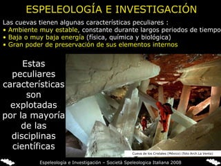 El documento describe cómo las cuevas son herramientas valiosas para muchas disciplinas científicas debido a sus características estables y su poder de preservación. Las cuevas se han utilizado en arqueología, biología, geología, hidrogeología y otras áreas para estudiar el pasado, la evolución, los procesos geológicos y más.