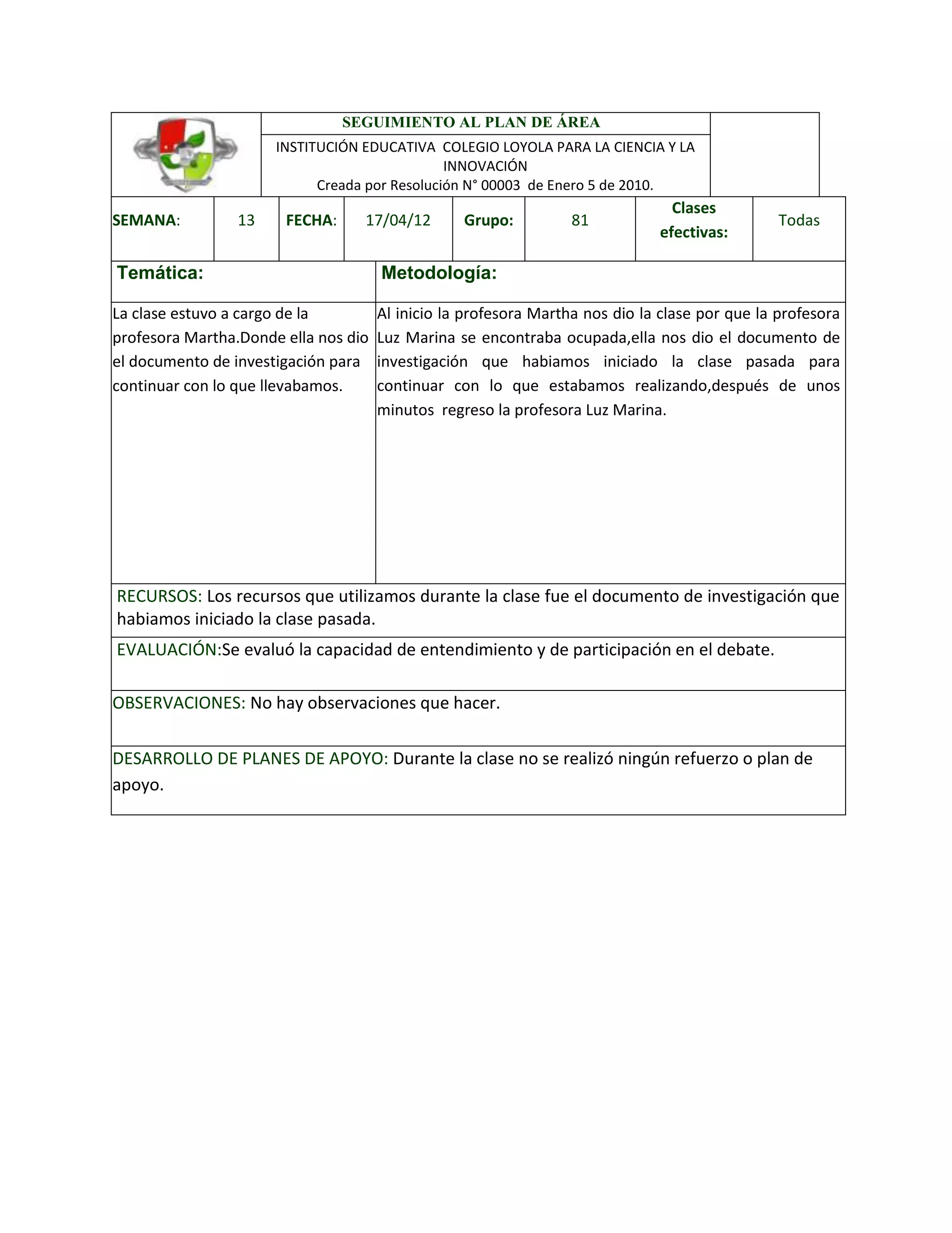 El resumen describe una clase en la Institución Educativa Colegio Loyola para la Ciencia y la Innovación. La profesora Martha dio la clase inicialmente y les entregó a los estudiantes el documento de investigación que habían comenzado la clase anterior para continuar trabajando en él. Después regresó la profesora Luz Marina. No hubo planes de apoyo ni observaciones que hacer.