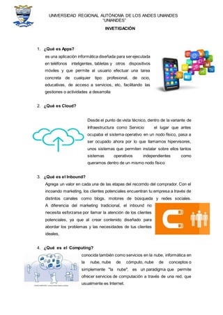 Este documento define varios términos clave relacionados con la tecnología móvil y la computación en la nube. Define una app como una aplicación diseñada para dispositivos móviles que permite a los usuarios realizar tareas específicas de manera más fácil. Define cloud computing como la provisión de servicios de computación a través de una red como Internet utilizando hipervisores que permiten múltiples sistemas operativos en un solo nodo físico. Define inbound marketing como atraer clientes potenciales creando contenido útil en