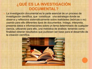 La investigación documental es una técnica esencial de la investigación científica que involucra el análisis sistemático de documentos para obtener información sobre un tema. Tiene como propósito analizar diferentes fenómenos a través de la documentación existente. Surge de la necesidad de organizar los hallazgos de la investigación y utiliza técnicas precisas como observación, entrevistas y encuestas. El investigador documental recolecta, selecciona y analiza información de manera ordenada para construir conocimiento.