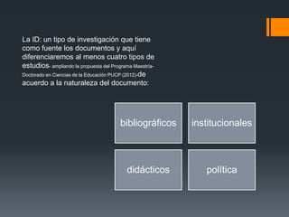 El documento introduce cuatro tipos de estudios documentales - bibliográficos, institucionales, de política y didácticos - y proporciona ejemplos de cada uno. Explica que los estudios bibliográficos analizan tendencias en literatura académica sobre un tema, los institucionales investigan aspectos internos de una organización usando sus documentos, los de política analizan documentos de política educativa, y los didácticos usan materiales de enseñanza-aprendizaje como fuente primaria.