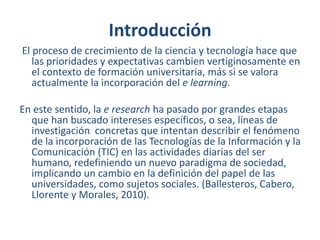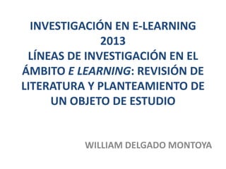 Este documento presenta una revisión de literatura sobre líneas de investigación en e-learning. Resume cuatro líneas principales: 1) infraestructura tecnológica y plataformas de aprendizaje, 2) contenidos en la web, 3) estrategias metodológicas colaborativas y evaluación, y 4) evaluación en línea y MOOCs. Luego, define el protocolo de investigación para seleccionar un objeto de estudio, incluyendo buscadores, bases de datos y palabras clave. Finalmente, presenta el objeto