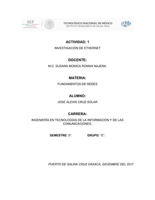 Este documento presenta una investigación sobre el protocolo Ethernet. Se describen los objetivos de Ethernet como simplicidad, bajo costo, compatibilidad y alta velocidad. También se explican los componentes básicos de Ethernet como el medio físico, los componentes de señalización, el conjunto de reglas para acceder al medio y el frame Ethernet. Finalmente, se analizan conceptos como los estándares de Ethernet, la encapsulación de paquetes, las direcciones MAC y los tipos de direccionamiento en Ethernet.