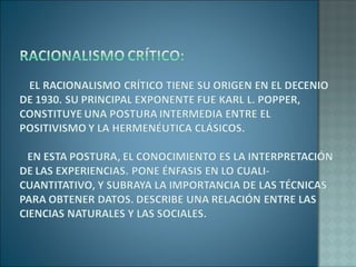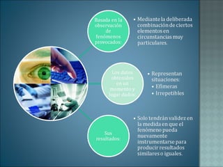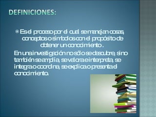 El documento describe el proceso de investigación como una herramienta para generar conocimiento de manera objetiva y sistemática. Explica que existen diferentes tipos de investigación como la documental, de campo y experimental, las cuales siguen metodologías específicas para lograr sus objetivos. También distingue entre investigaciones puras y aplicadas.