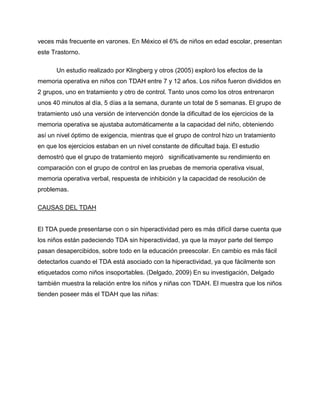 El documento habla sobre la investigación del Trastorno por Déficit de Atención con Hiperactividad (TDAH). Explica que el TDAH afecta los neurotransmisores como la dopamina, norepinefrina y serotonina. También menciona factores como genéticos, ambientales y sociales que pueden contribuir al desarrollo del TDAH. Describe los síntomas del TDAH en niños de diferentes edades y cómo se manifiesta el trastorno a lo largo de la vida.