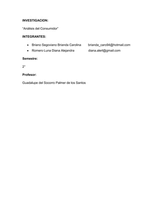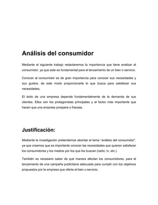 El documento presenta un proyecto de investigación sobre el análisis del consumidor realizado por dos estudiantes. El objetivo es analizar cómo afecta el consumidor en el lanzamiento de una campaña publicitaria mediante el estudio del caso de Coca-Cola. Se describen los métodos, preguntas de investigación, y se incluye una entrevista y encuesta para analizar los factores que influyen en la decisión del consumidor.