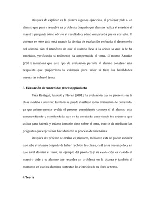 El documento analiza una clase de matemáticas a nivel primario sobre triángulos. El profesor utiliza varias técnicas de evaluación como preguntas orales para evaluar el aprendizaje de los estudiantes, pedir a los estudiantes que resuelvan problemas en la pizarra para evaluar su desempeño, y dejar tareas para evaluar su comprensión del contenido. La clase es un buen ejemplo de integrar la evaluación con la enseñanza.