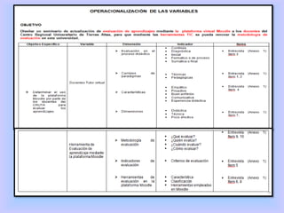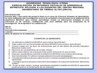 Este documento describe un proyecto de investigación que busca diseñar un seminario de actualización para docentes sobre la evaluación de aprendizajes mediante la plataforma virtual Moodle. El objetivo es que los docentes del Centro Regional Universitario de Tierras Altas utilicen las herramientas de Moodle para innovar sus procesos de evaluación. La investigación analizará el uso actual de Moodle, identificará herramientas de evaluación y diseñará la estructura del seminario de actualización.