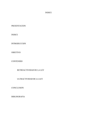 Este documento presenta una introducción a los conceptos de retroactividad y ultractividad de la ley. Explica que la retroactividad se refiere a aplicar una ley posterior a un hecho ocurrido bajo una ley anterior, mientras que la ultractividad significa que una ley derogada continúa aplicándose a algunos casos específicos. También resume las teorías de la irretroactividad y explica que la irretroactividad no es absoluta, permitiendo la aplicación de leyes más benignas.
