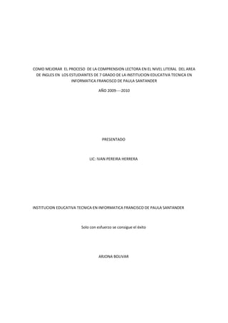 Este documento describe los objetivos de mejorar el proceso de comprensión lectora en el nivel literal del área de inglés en estudiantes de 7o grado. Explica la importancia de la comunicación y el lenguaje, y la necesidad de enseñar inglés de manera efectiva. También resume los antecedentes históricos de cómo se ha enseñado inglés en Colombia, desde métodos conductistas hasta el enfoque comunicativo actual. El objetivo general es mejorar la comprensión lectora en el nivel literal a través de actividades pedagó