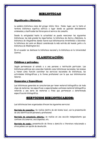 El documento resume la historia y clasificación de las bibliotecas. Explica que las bibliotecas almacenan libros de forma ordenada para consulta y que pueden ser públicas o privadas, generales u especializadas. También describe los servicios básicos que ofrecen como consulta, estantería abierta y canje de libros. Explica las características de libros, periódicos, revistas y enciclopedias. Por último, cubre temas como la lectura, hábitos de estudio y toma de notas.