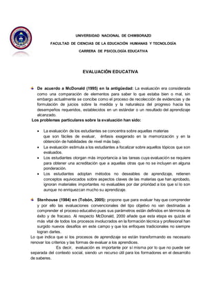 El documento habla sobre la evaluación educativa. Explica que la evaluación actualmente se concibe como un proceso de recolección de evidencias y formulación de juicios sobre el progreso de los estudiantes hacia los objetivos de aprendizaje. También discute problemas comunes de la evaluación como un enfoque excesivo en la memorización y habilidades básicas. Además, propone que la evaluación debe adaptarse a cada estudiante y ayudar a mejorar sus puntos débiles.