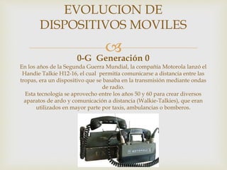 El documento resume la evolución de los dispositivos móviles desde las generaciones 0G hasta 4G, describiendo los cambios tecnológicos clave en cada era, como el paso de la analogía a la digital y el aumento en la velocidad de datos. También discute los principales procesadores usados en dispositivos móviles como ARM, Snapdragon, Exynos y OMAP, así como los sistemas operativos móviles emergentes como Android e iOS.