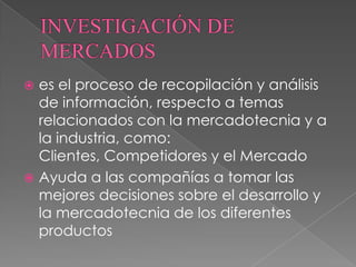 La investigación de mercados es el proceso de recopilar y analizar información sobre clientes, competidores y el mercado para ayudar a las empresas a tomar mejores decisiones de desarrollo y marketing. Existen cuatro tipos principales de estudios: investigación cuantitativa, cualitativa, documental y secundaria. Los pasos clave incluyen definir el problema a investigar, seleccionar el diseño, recopilar y analizar datos, y formular hallazgos.