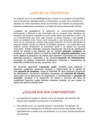 Un proyecto consiste en un conjunto de actividades interrelacionadas y coordinadas que buscan alcanzar metas específicas dentro de los límites de un presupuesto, calidad y tiempo predefinidos. La gestión de proyectos aplica conocimientos y técnicas para satisfacer los requisitos del proyecto. Existen diferentes tipos de proyectos dependiendo de su nivel de planificación y objetivos, como proyectos sociales, de programa, de estudios e inversiones.