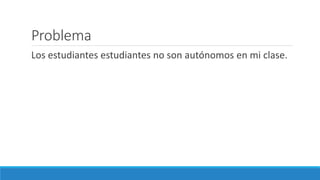 Este documento presenta estrategias para desarrollar la autonomía en los estudiantes. Propone tres estrategias: 1) encargar a los estudiantes diseñar actividades para la clase, 2) identificar necesidades de aprendizaje y recursos para estudiar de manera autónoma, y 3) diseñar una rúbrica y proyecto para demostrar conocimiento. Los resultados de una encuesta mostraron que estas estrategias facilitaron el desarrollo de la autonomía, especialmente una de ellas. Se recomienda implementar opciones alternativas de evaluación